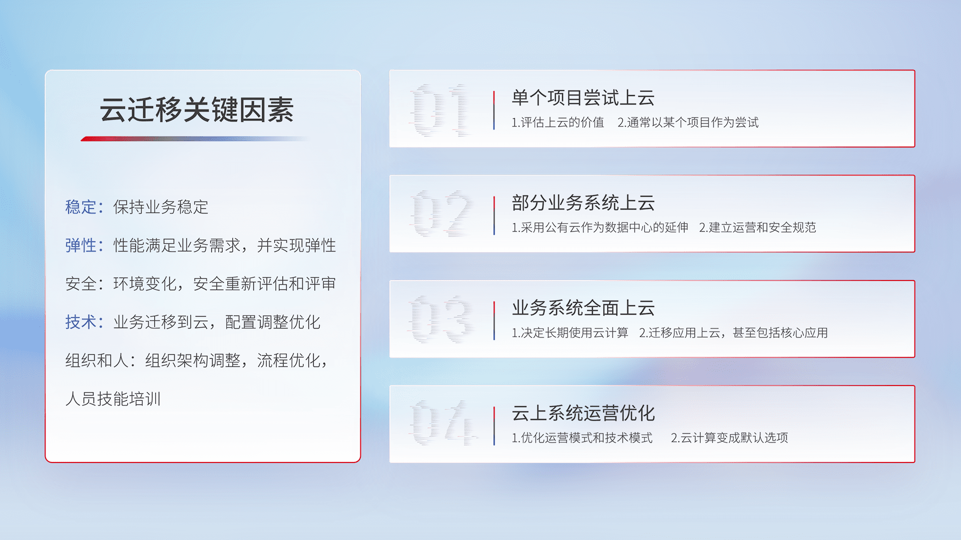 结合实际业务,,从规划设计、、云平台选型、、、云原生改造、、、数据迁移、、、集成交付,,,迁移全过程为客户识别最佳上云路径,,做好风险识别管理,,,设计网络架构、、身份权限、、、安全审计合规、、、、操作审计、、日志审计、、、、监控告警策略、、多站点容灾设计等,,对云上基础设施进行整体规划,,,,提升IT治理水平,,以满足弹性、、高可用、、高性能的需求。。。。
