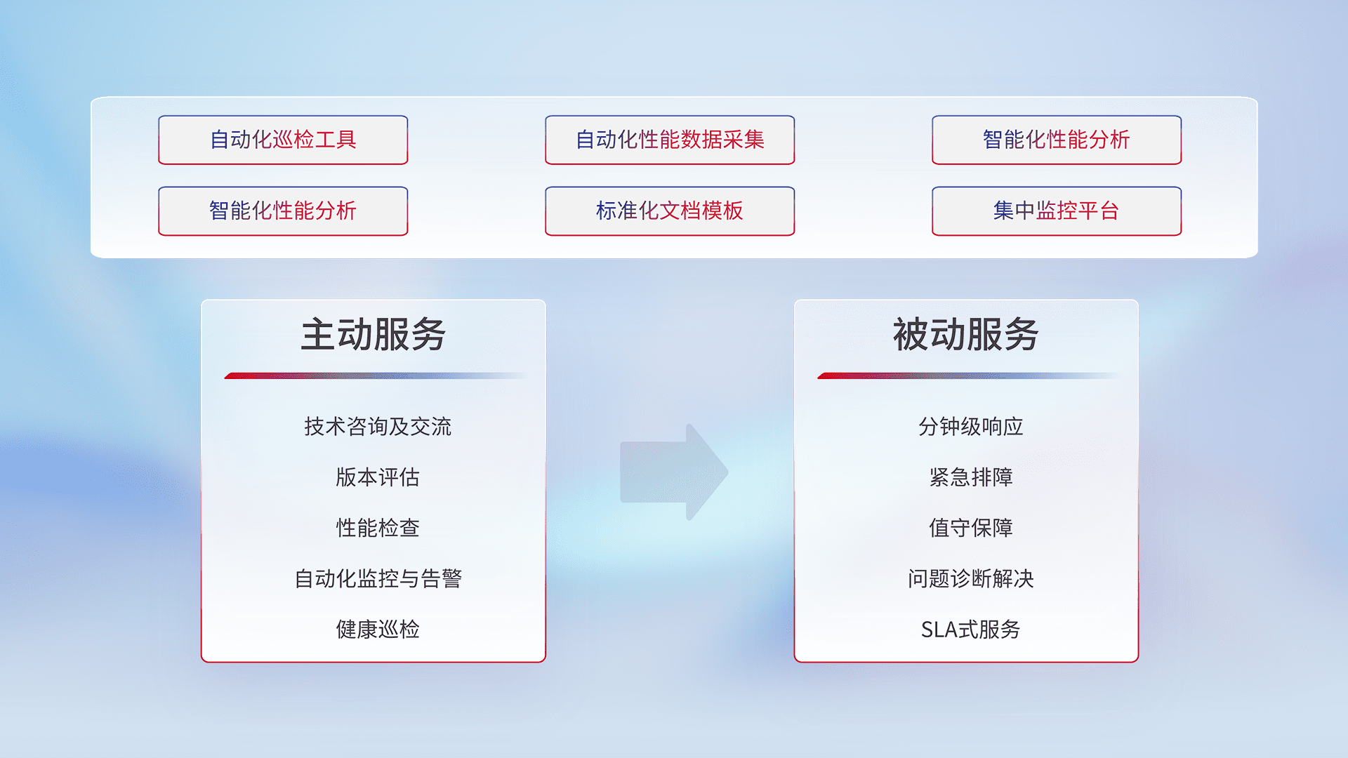 智能化工具和标准化文档,,,保障服务质量,,提供主动服务(包含技术咨询、、、、版本评估、、、性能检查、、自动化监控与告警、、、、健康巡检)和被动服务包含(分钟级响应、、、紧急排障、、值守保障、、、、问题诊断解决、、、SLA服务)。。。
